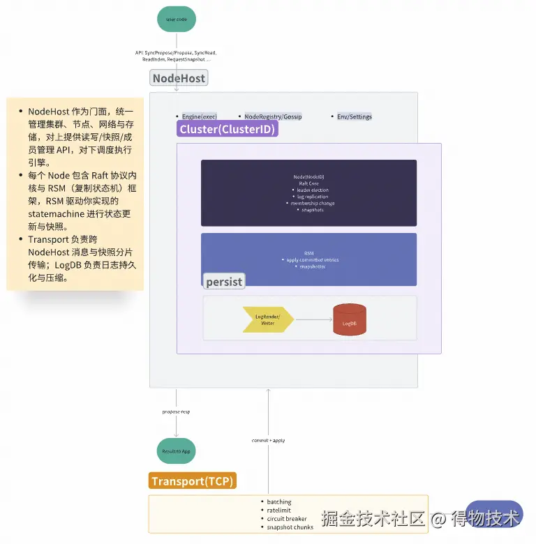 为应用屏蔽 Raft 复杂性,提供易于使用的 NodeHost 和状态机接口。该库(自称)有如下特点: