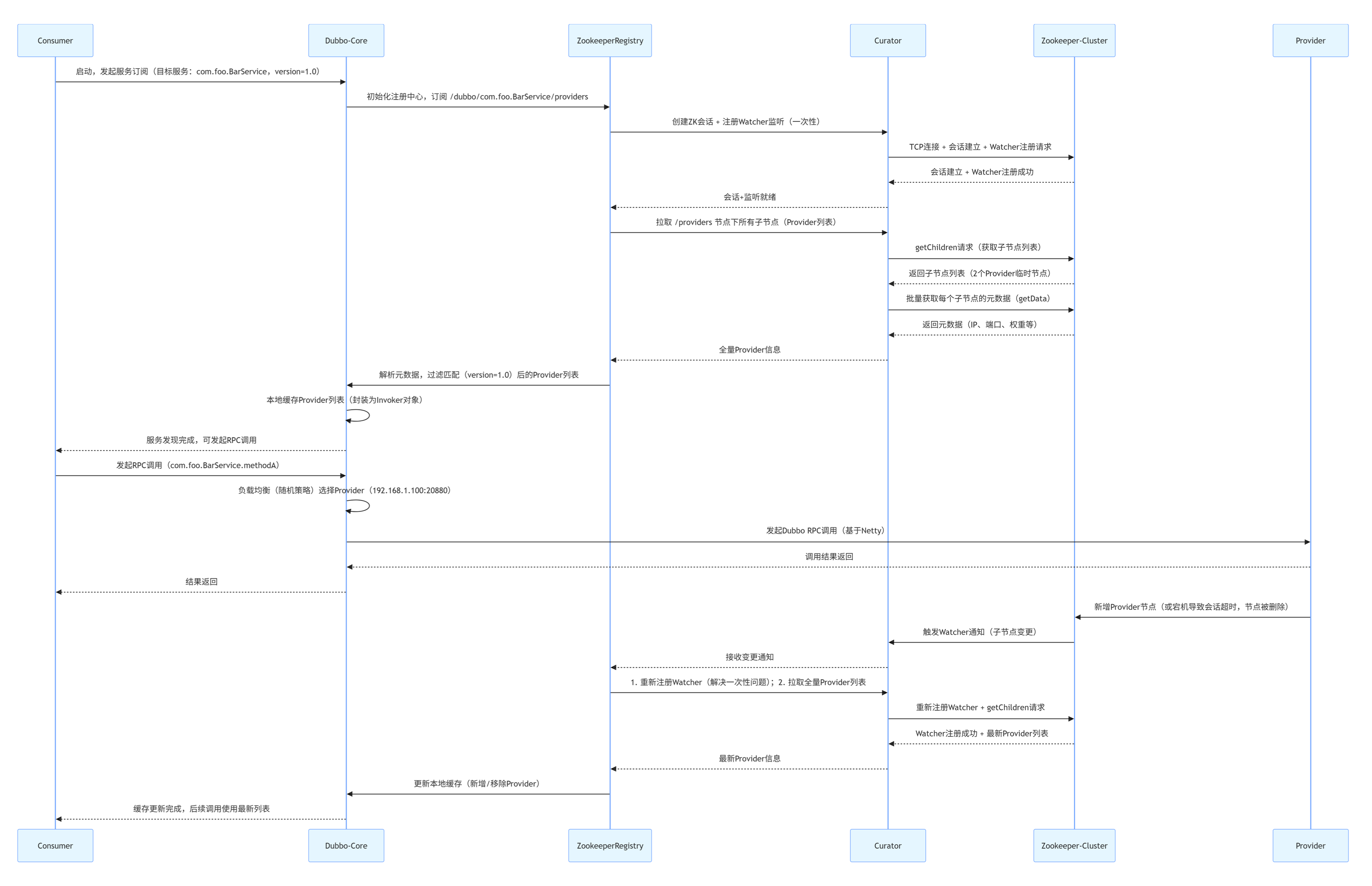 Consumer 启动后,需从 Zookeeper 获取 Provider 列表并监听变更,核心流程如下,包含订阅、缓存、更新三个关键环节: