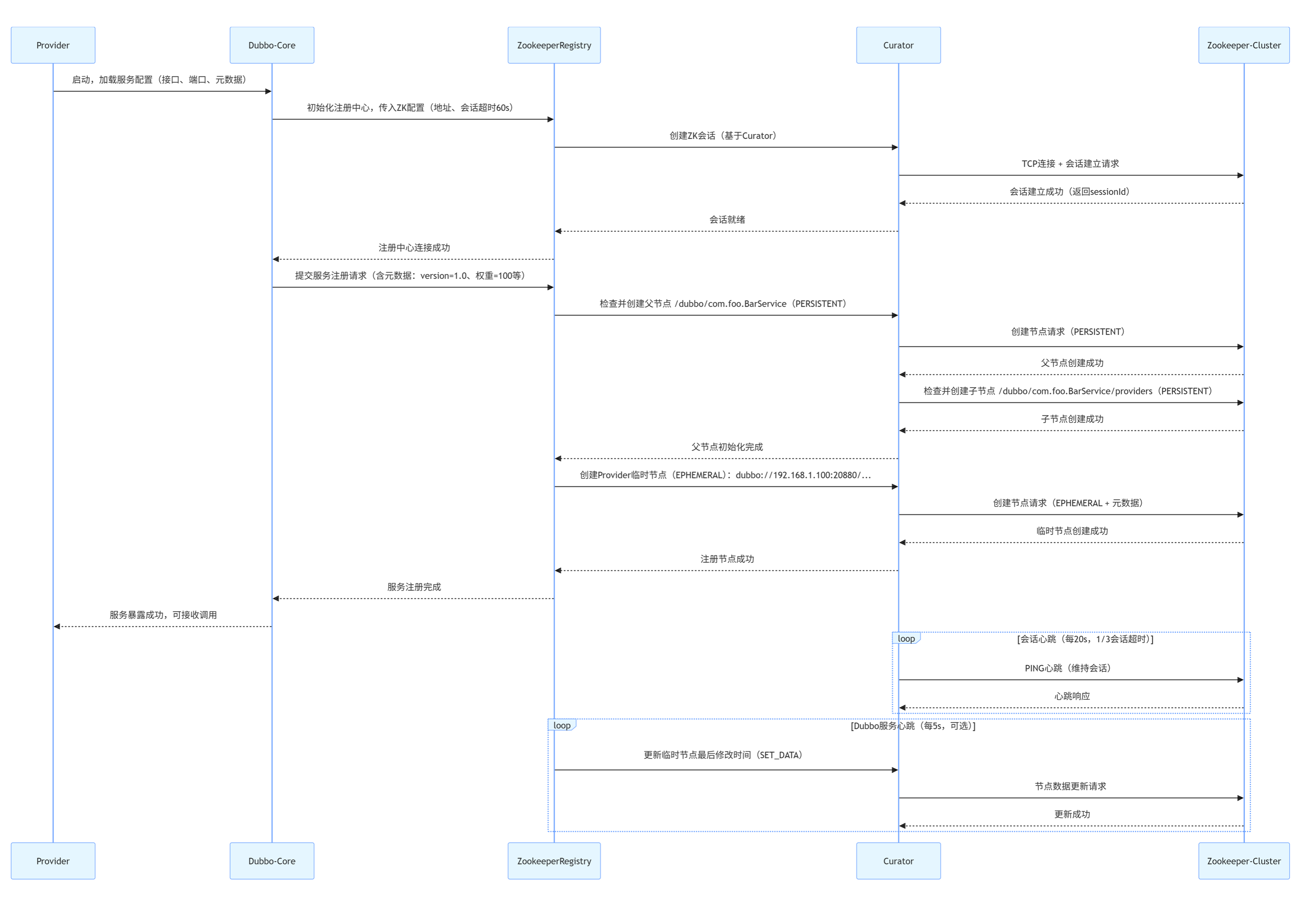 ZookeeperRegistry类(Dubbo 注册中心适配层)加载 Zookeeper 配置(地址、会话超时时间、重试策略等); - 基于 Apache Curator(Dubbo 底层依赖的 ZK 客户端,封装了原生 ZK 客户端的复杂操作)创建 ZK 会话,建立与 ZK 集群的 TCP 长连接;