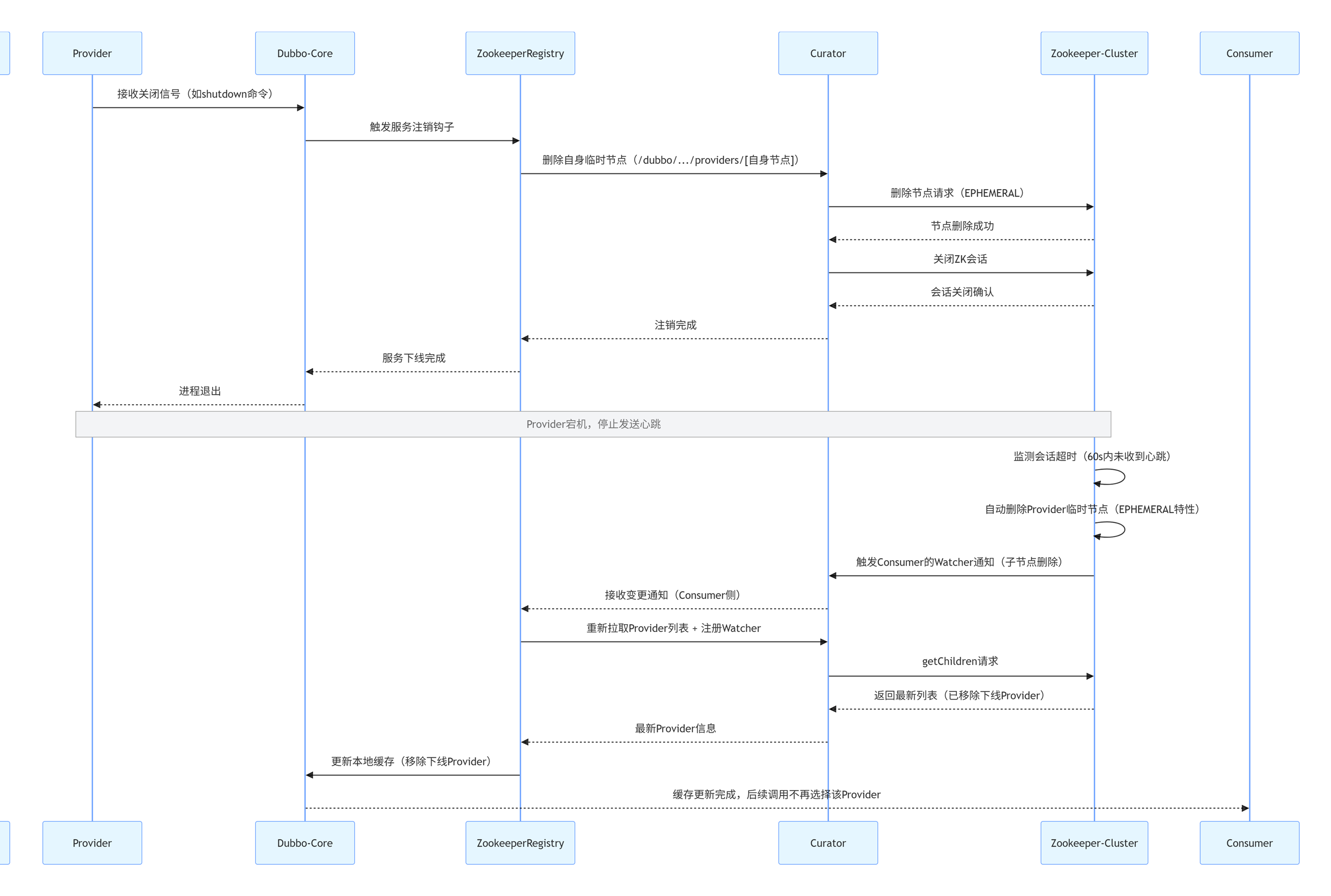 shutdown命令),Dubbo 会触发destroy钩子,通过ZookeeperRegistry主动删除providers下的自身临时节点,同时关闭 ZK 会话; - 被动下线:Provider 宕机或网络中断时,无法主动删除节点,此时 ZK 会在会话超时(默认 60s)后,自动清理该临时节点,实现"故障自动剔除"。