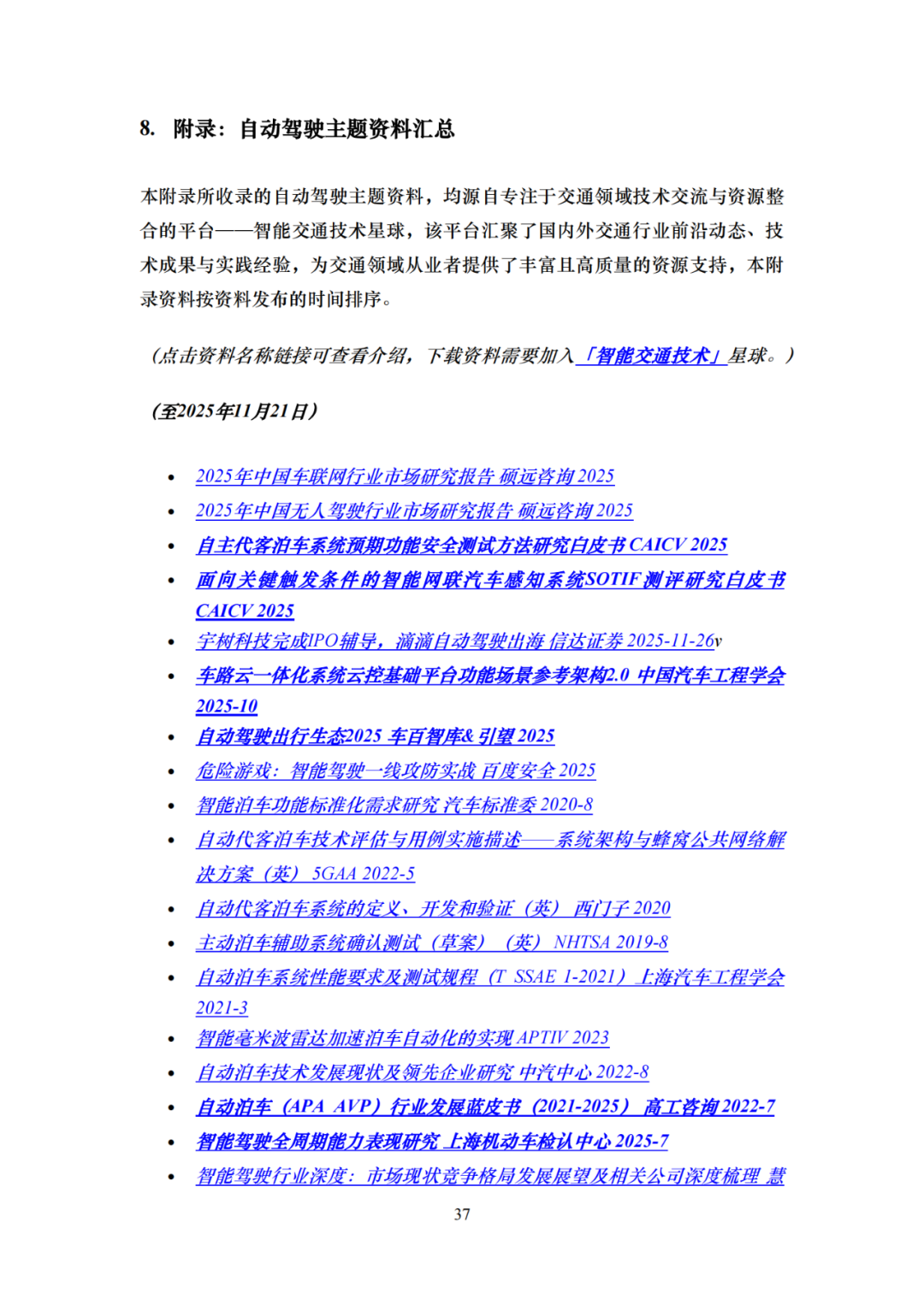 本附录所收录的自动驾驶主题资料,均源自专注于交通领域技术交流与资源整合的平台------智能交通技术星球,该平台汇聚了国内外交通行业前沿动态、技术成果与实践经验,为交通领域从业者提供了丰富且高质量的资源支持,本附录资料按资料发布的时间排序。