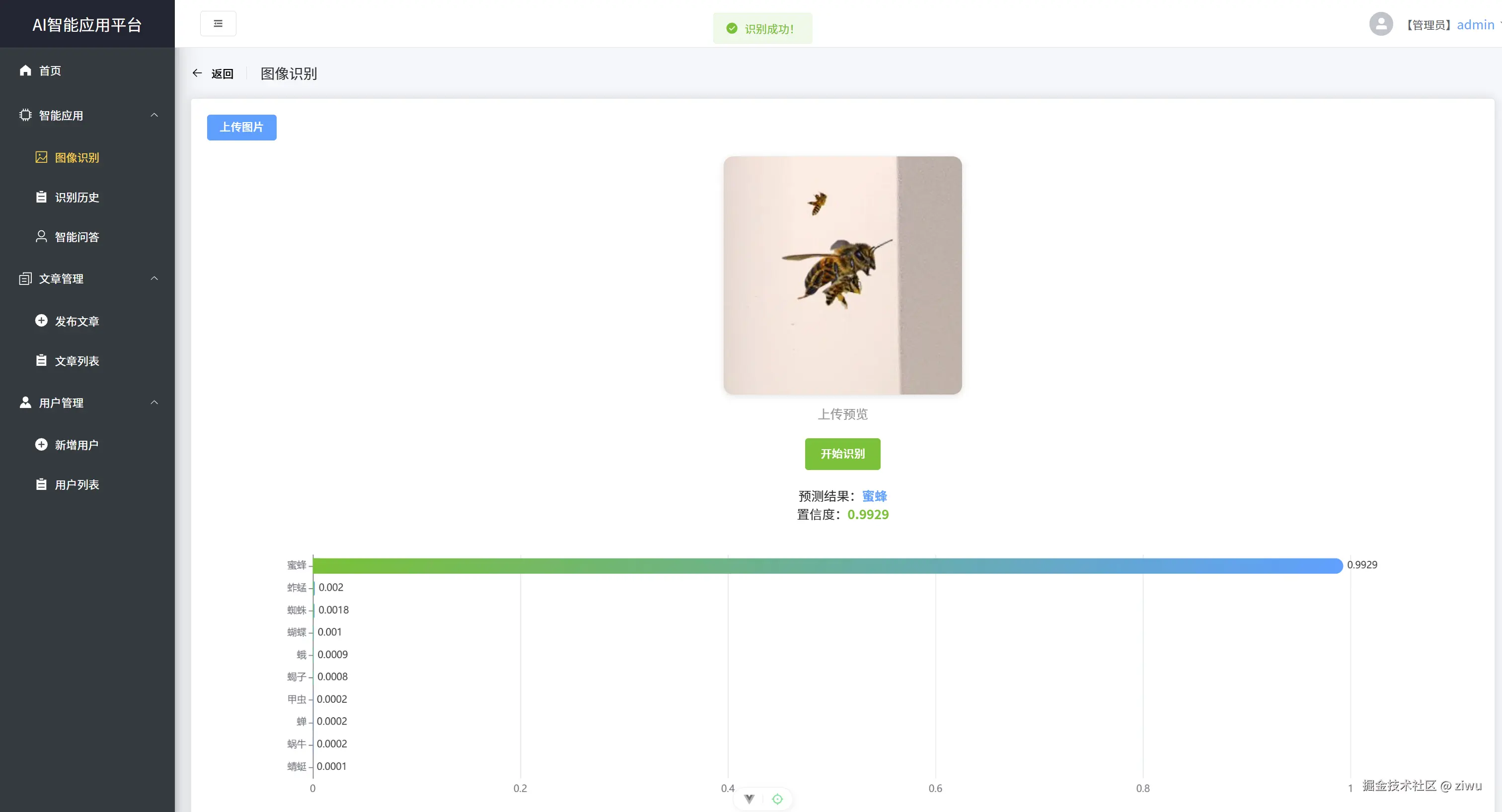 - 在图像识别功能中,用户上传图片后,点击识别,可输出其识别结果和置信度
