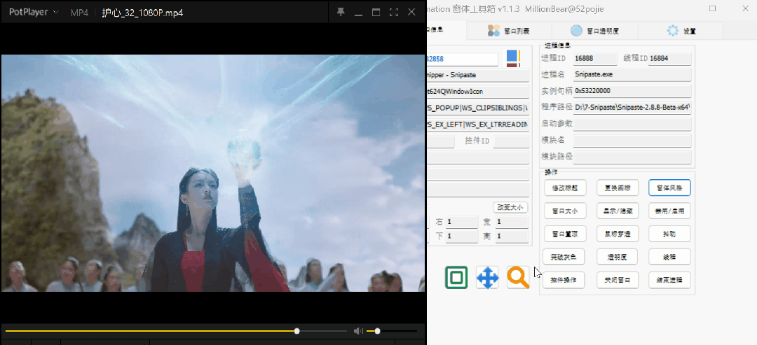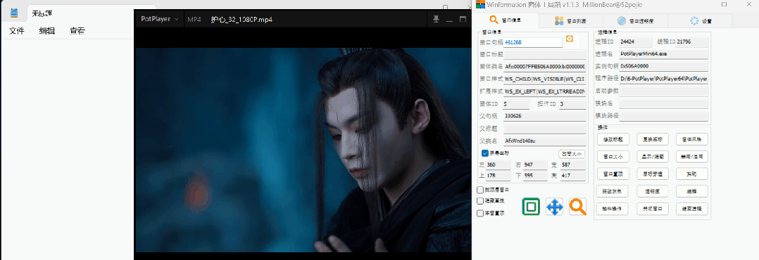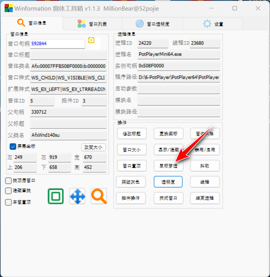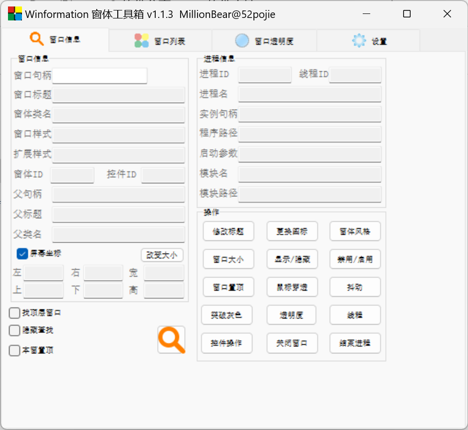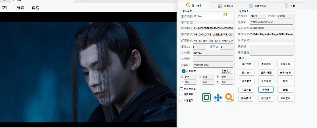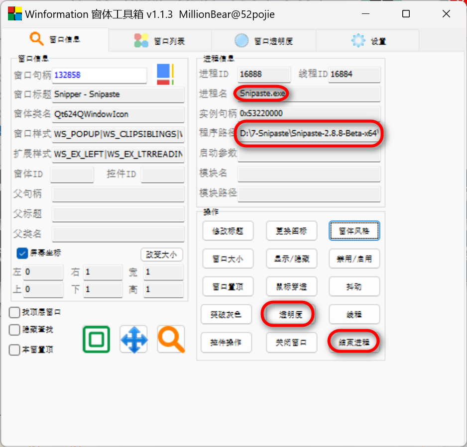**窗口信息:**上面的【窗口列表】双击即会到达窗口信息界面,在这个界面里我们可以获取到进程的名称、程序路径,还可以结束进程、调节透明度、窗口置顶等等。