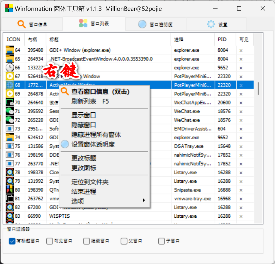 右键进程可查看窗口信息、可显示窗口、可隐藏窗口、可设置透明度、可更改图标等等操作。