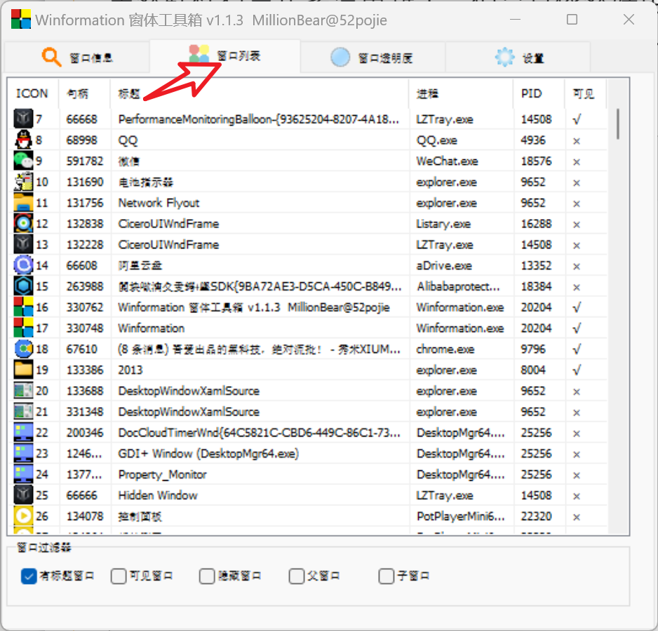 **窗口列表:**窗口列表里有我们电脑打开的所有的程序信息,其包括可见的进度和不可见的进程,它都有显示。