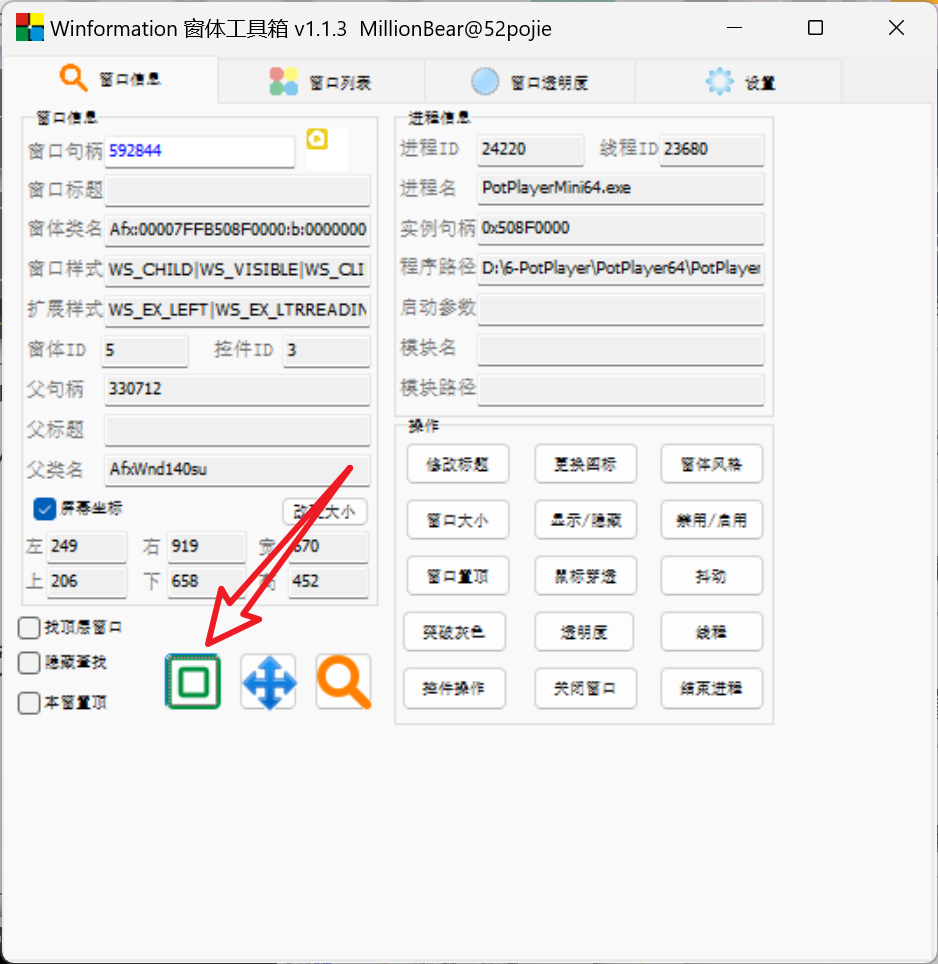 而在"Winformation窗体工具箱"里只要按住搜索的图标,拖到软件界面中即可显示该软件的信息。