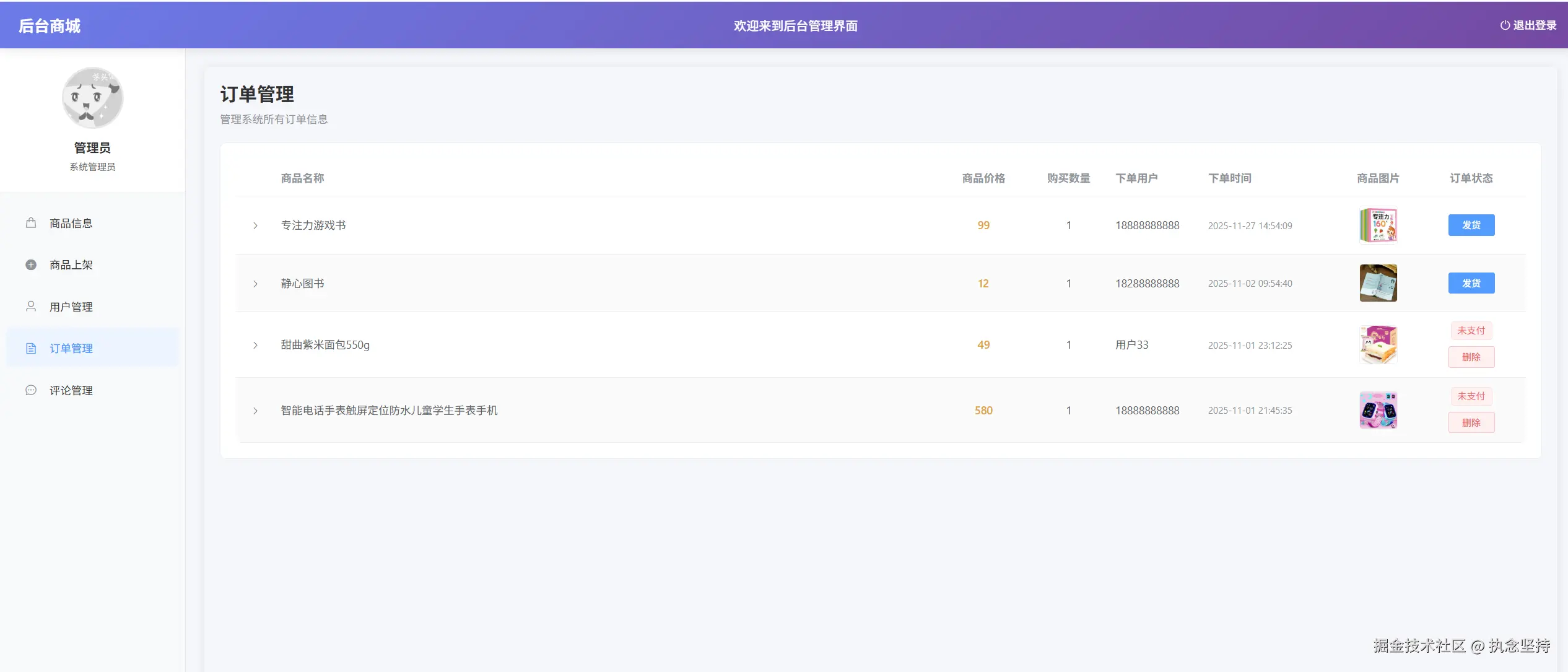 - 下单未支付(超时管理员可删除订单)