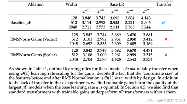 它对什么情况不够稳健呢,显然,这种方法并非适用于所有情况,例如,若引入可学习的增益参数(RMSnorm gain),这会导致 muP 失效,因此必须移除偏置项,移除偏置项后,muP 机制就能正常工作,一旦重新引入偏置项,muP 很可能再次失效