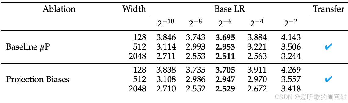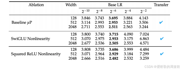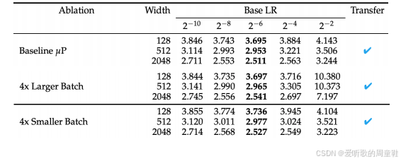 答案是肯定的,研究者设置了不同的网络宽度:128、512、2048,各列采用不同的学习率,这样的理想策略是:我们先在小规模模型上进行学习率扫描,选择最小规模的模型进行测试,然后逐步放大规模,希望这个基准学习率能始终保持最优,事实上,只要我们进行这种相对准确的宽度缩放,学习率在不同模型规模间的迁移表现得非常可靠