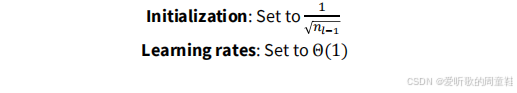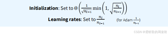 将参数初始化为 Θ ( 1 n l − 1 min ( 1 , n l n l − 1 ) ) \Theta \left( \frac{1}{ \sqrt{n_{l-1}}} \min \left( 1, \sqrt{ \frac{n_{l}}{n_{l-1}}} \right) \right) Θ(nl−1 1min(1,nl−1nl )),当输入维度小于输出维度时修正系数 min ( 1 , n l n l − 1 ) \min \left( 1, \sqrt{ \frac{n_{l}}{n_{l-1}}} \right) min(1,nl−1nl ) 等于 1,否则取 n l n l − 1 \sqrt{ \frac{n_{l}}{n_{l-1}}} nl−1nl ,这就是高斯分布尺度参数的一个简易初始化方案。在使用随机梯度下降时,学习率应设置为 n l n l − 1 \frac{n_l}{n_{l-1}} nl−1nl,但若采用 Adam 优化器,设置方式会略有不同,此时学习率应取 1 n l − 1 \frac{1}{n_{l-1}} nl−11