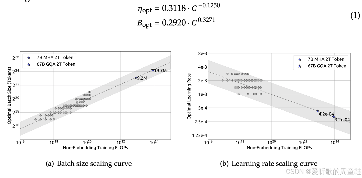 Cerebras-GPT 与 MiniCPM 都依赖 muP 稳定扩展,并结合 WSD(预热--稳定--衰减)学习率调度 来在一次训练中近似复现 Chinchilla 曲线,使 "模型规模 vs 数据规模" 的最优点能够高效确定。DeepSeek 则走另一条路线,通过系统扫描 batch size 与学习率,利用 IsoFLOPs(等计算量)曲线 精确拟合最优的计算分配策略,并从小模型外推到 7B / 67B 模型实现准确命中。