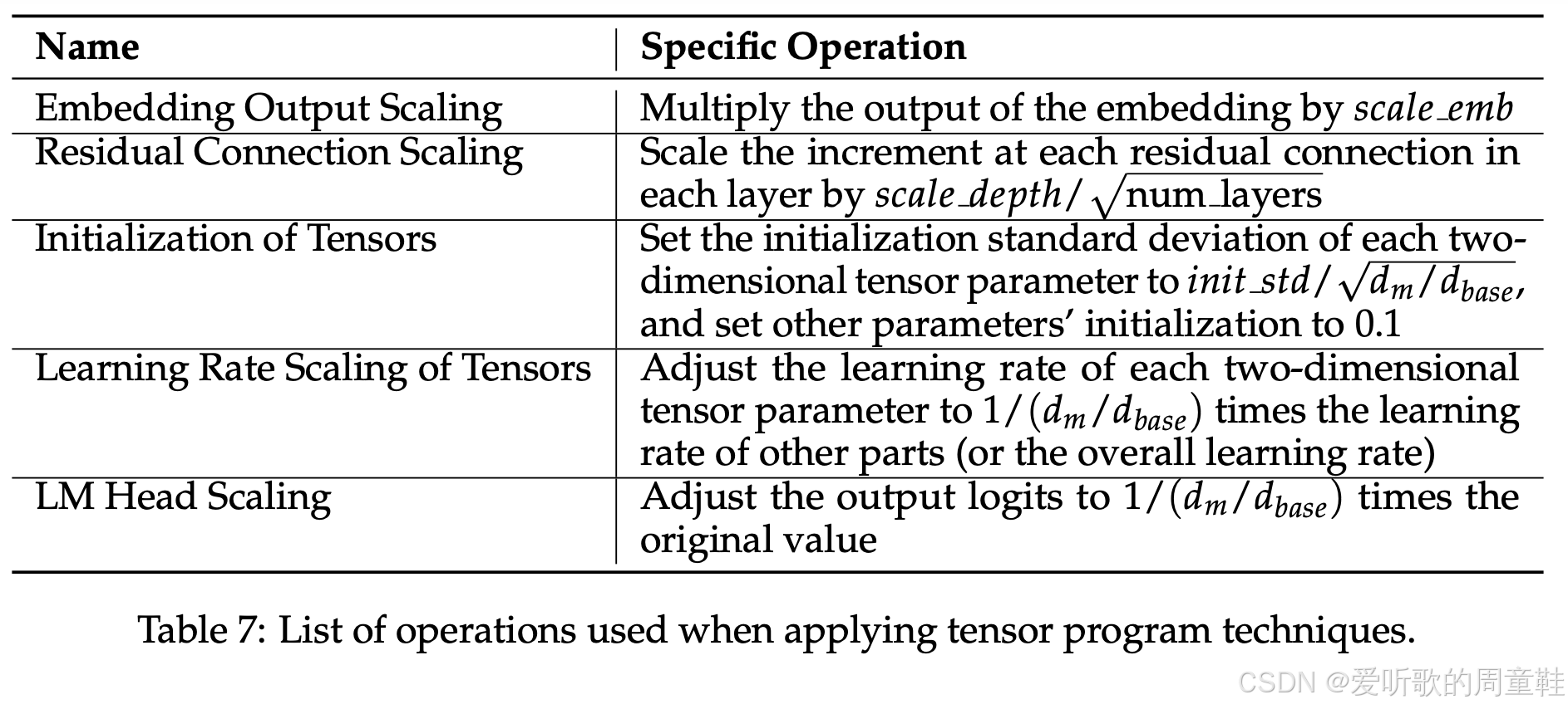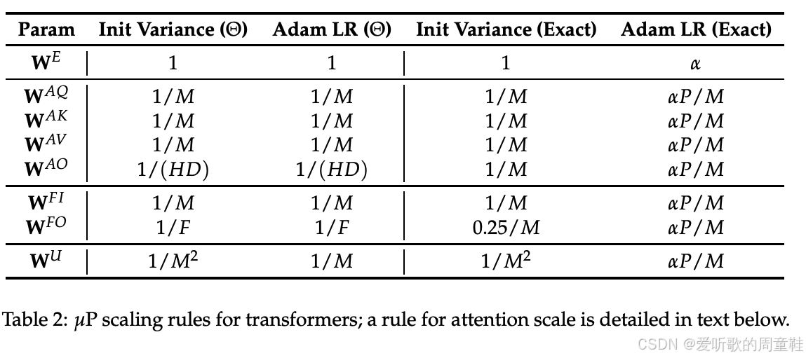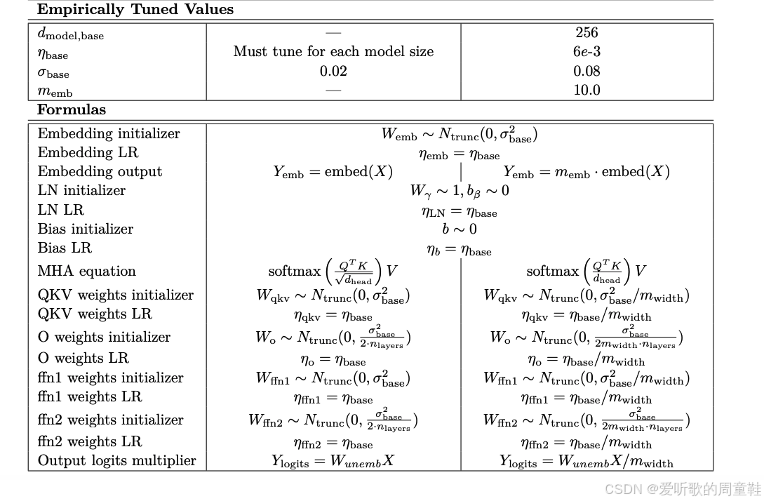 可以看到,这里采用的策略完全如出一辙,对于嵌入层,实际上无需特殊处理,只需按常数比例进行缩放即可,当遇到类似多层感知机(MLP)这样的残差连接结构时,只需将其缩放为层数的平方根倍,即乘以 1 / num_layers 1/\sqrt{\text{num\_layers}} 1/num_layers ,其中 num_layers 为层数,初始化时采用其宽度的倒数作为缩放因子,而模型的学习率则需根据网络宽度进行同步缩放