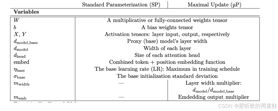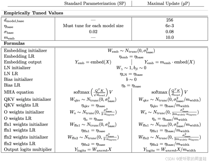 用一句话概况:基本上,所有非嵌入参数都以宽度的倒数作为初始值,而每一层的学习率则按宽度的倒数进行缩放 ,与标准参数化方法的关键差异在于---即便初始化阶段同样采用宽度倒数缩放,但其引入了分层差异化的学习率机制,这一点我们稍后会详细说明,我们将完整推导这个结果的数学过程,不过这里可以先看上面这个简明的速查表,若需具体实现,这套方法为 μ P \mu P μP 的实施提供了极其便捷的路径