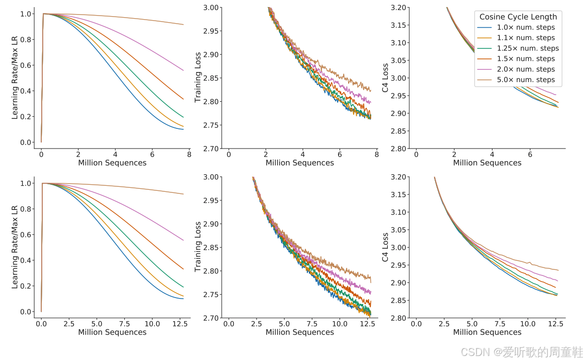 上面这张图表清晰地揭示了其中的运行机制,我们通常采用的训练方法是这张黄色曲线所示的余弦学习率,学习率首先上升,经过一个通常很短暂的预热阶段后,学习率会达到峰值,随后遵循余弦曲线逐渐衰减至终止点,最终可能维持在最低学习率水平