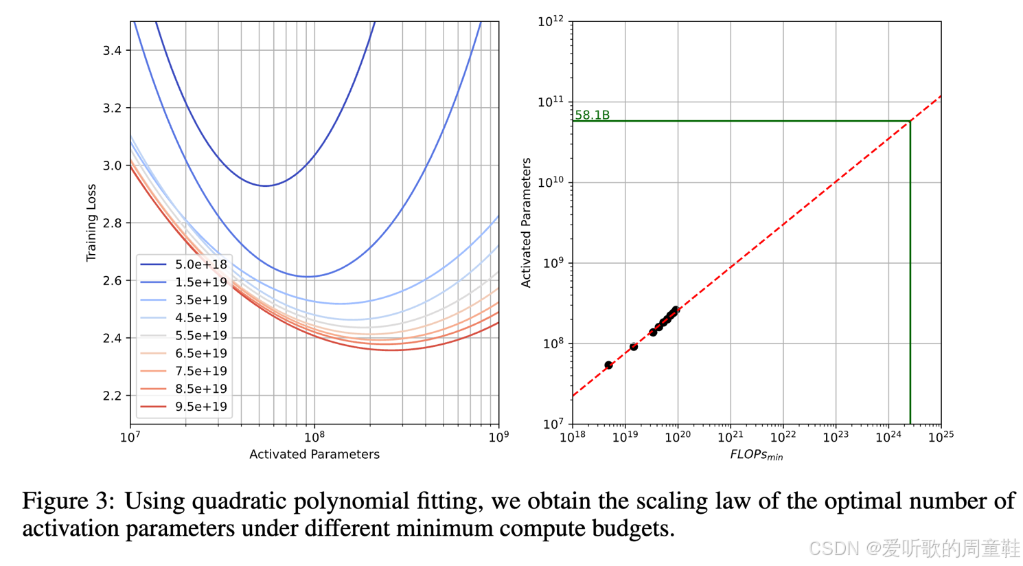 他们再次进行了等参量分析,他们采用了二次函数拟合,通过计算极值点,他们确定了新的 token 与参数配比,最终得出了 96:1 的训练数据与激活参数配比,由于 MoE 架构的特殊性,这些配比显然会存在显著差异,我们并不预期会得到与 Chinchilla 模型相同的结果