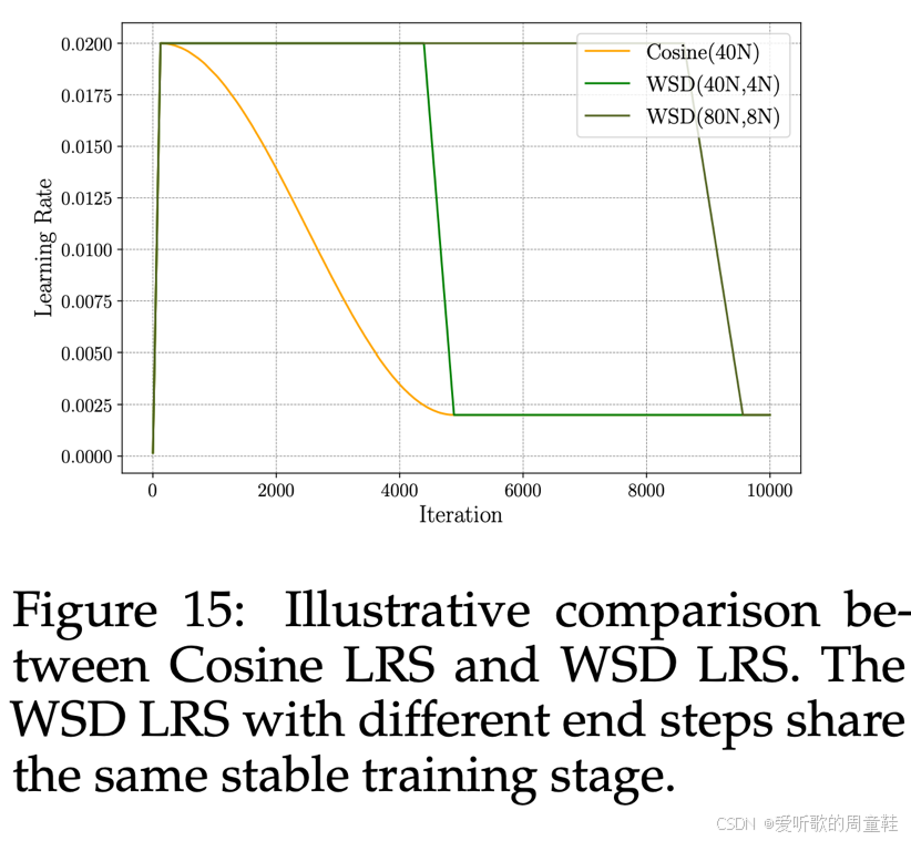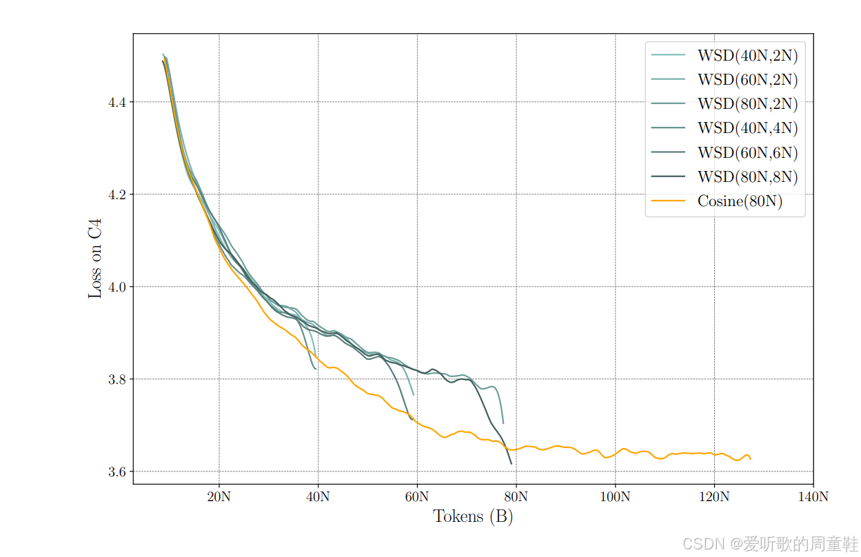 这里的关键发现是:在每一个 token 数量级上,预热-稳定-衰减学习率曲线的最低点都优于或等同于余弦学习率的表现。但这并非绝对规律,有时余弦学习率效果更佳,有时预热-稳定-衰减(WSD)策略更具优势,但总体而言,业界普遍认为这两种学习策略效果相当。不过 WSD 方案还有个显著优势,那就是无需纠结训练终止时机的选择,你可以通过多次冷却过程,轻松获取不同数量级的检查点