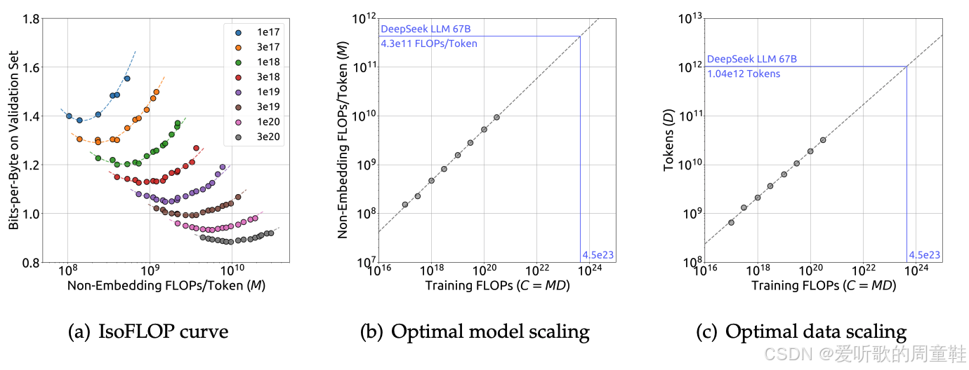 DeepSeek 采取了略有差异的技术路线,他们认为大多数超参数本质上不会随模型规模而变化,但他们针对 batch size 和学习率进行了完整的扩展性分析,并运用缩放定律来推导最优的扩展方案,他们采用了等计算量分析法,他们再次复现了 Chinchilla 实验来确定模型规模参数,确保各项指标处于合理的数量级范围