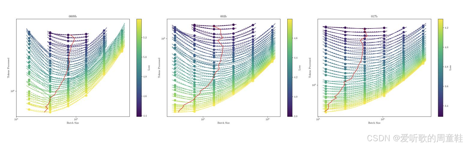 图中纵列代表单条训练曲线,随后通过拟合二次曲线来定位最小值,图中红线代表随着训练进程推进,所有数据点中的最优值轨迹,这表明在特定模型规模与数据集大小的组合下,最优 batch size 的确定方法可沿用 Kaplan 论文中的逻辑框架来确定