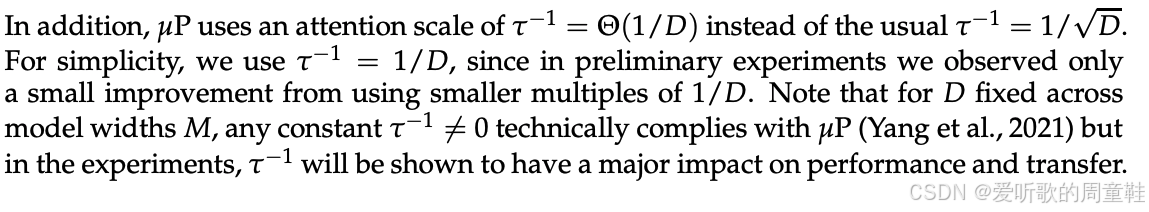 所有 muP 论文都存在一个微妙但古怪的共同点,如果你还记得 Transformer 架构,就会想起其中注意力机制中的激活值也需要进行特定缩放,在计算内积后,需要将结果乘以 1 / D 1/\sqrt{D} 1/D 进行缩放,这个神奇的常数正是最合适的缩放因子,muP 与其他相关论文研究采用 1 / D 1/D 1/D 替代了传统的 1 / D 1/\sqrt{D} 1/D ,出于激活值与更新量稳定性的多层考量,这一点值得特别指出,因为乍看之下,你可能不会意识到这与 muP 存在关联