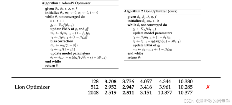 同样地,你也可以更前沿的优化器 Lion optimizer,Lion 优化器的设计确实有些反直觉,它通过对梯度取正弦函数来计算参数更新,这种操作初看颇为激进,但这种设计很可能源自进化算法等自动搜索技术,通过大规模参数空间探索最终筛选出的收敛速度最快的优化器架构