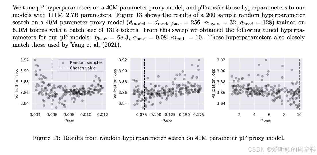 另外一个值得注意的现象是,我们在其他缩放策略中也观察到了类似情况,可以将这些策略组合使用,比如将 μ P \mu P μP(它能确保超参数选择稳定性)与极具侵略性的缩放方案相结合。他们的做法是将实验规模逐级减小,直至模型参数降至 4000 万量级,他们在这个代理模型(proxy model)上进行了全面的超参数搜索,随后运用 μ P \mu P μP 方法将模型重新放大,在此过程中尽可能保持超参数的稳定性