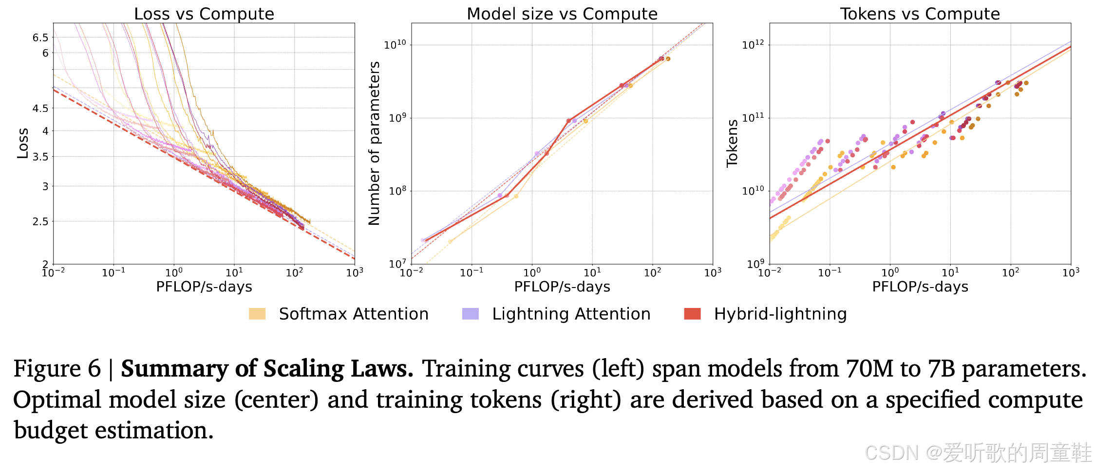 他们正致力于量化模型性能的代价曲线,从传统的 softmax 到线性注意力,再到混合架构的演进过程中,模型表现究竟会承受怎样的折损。为此,他们采用了类似 Chinchilla 研究中的方法 1:通过分析损失曲线的下包络线来评估不同注意力机制的性能边界,在训练过程中,他们会动态追踪两个核心指标:隐含最优模型规模与隐含最优训练 token 量