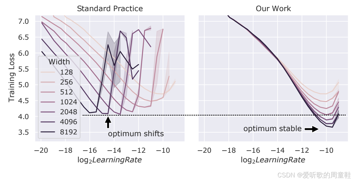 在左侧图可以看到,随着模型(本例中为 MLP 网络)宽度增加,最优学习率会逐渐下降,因此模型规模越大,所需学习率反而越小,这可能导致严重问题,因为在大规模训练时需要进行学习率调参,而这类超参数优化会带来极高的计算成本,这将成为重大瓶颈。反之,若能通过参数化方法使最优学习率在所有规模下保持恒定,那将实现重大突破,这也将极大简化参数搜索流程