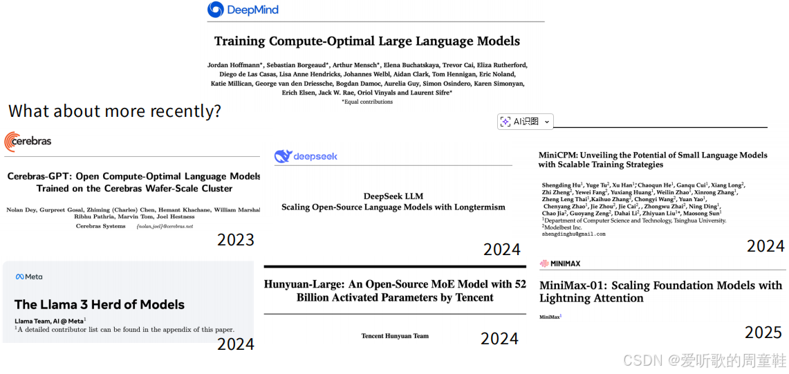 目前已有多个经过专业验证的大规模模型成功实现了扩展,在去年的课程中,我们重点讲解了 Cerebras-GPT、DeepSeek LLM 和 MiniCPM 三大模型,值得一提的是,去年我讲解这些中国模型时,还不得不专门解释选择它们的理由,但今年情况不同了,值得欣慰的是,现在提到 DeepSeek 时,大家已经自发表现出兴趣了,不再需要费力论证这些内容的价值