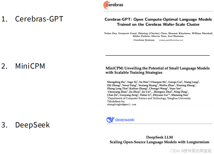 本次讲座案例研究的重点将聚焦于三个代表性模型,分别是 Cerebras-GPT、MiniCPM 以及 DeepSeek: