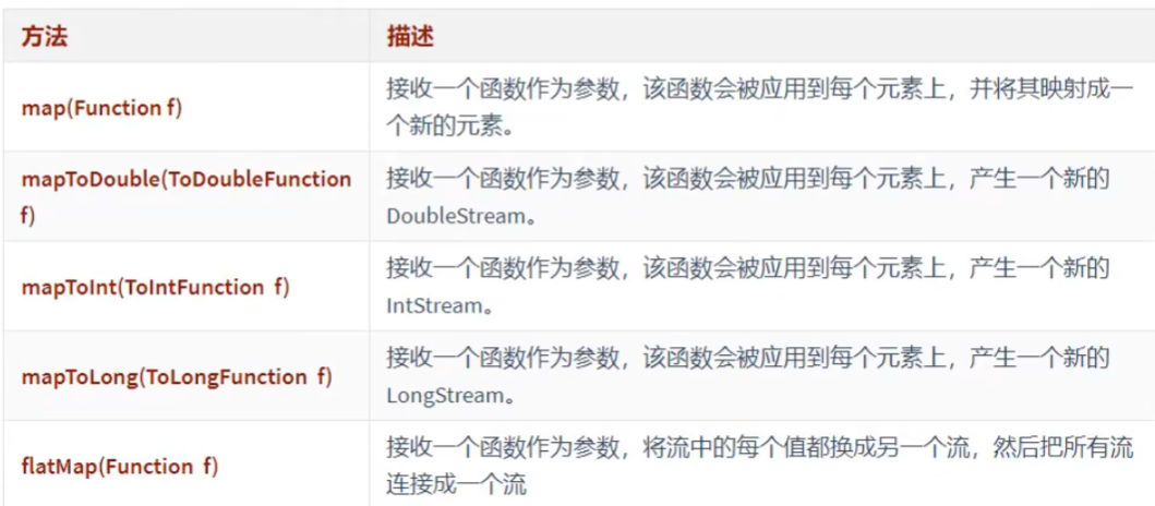 //map(Function f):接受一个函数作为承诺书,将元素转换为其他形式/提取信息,韩式应用到每个元素上)