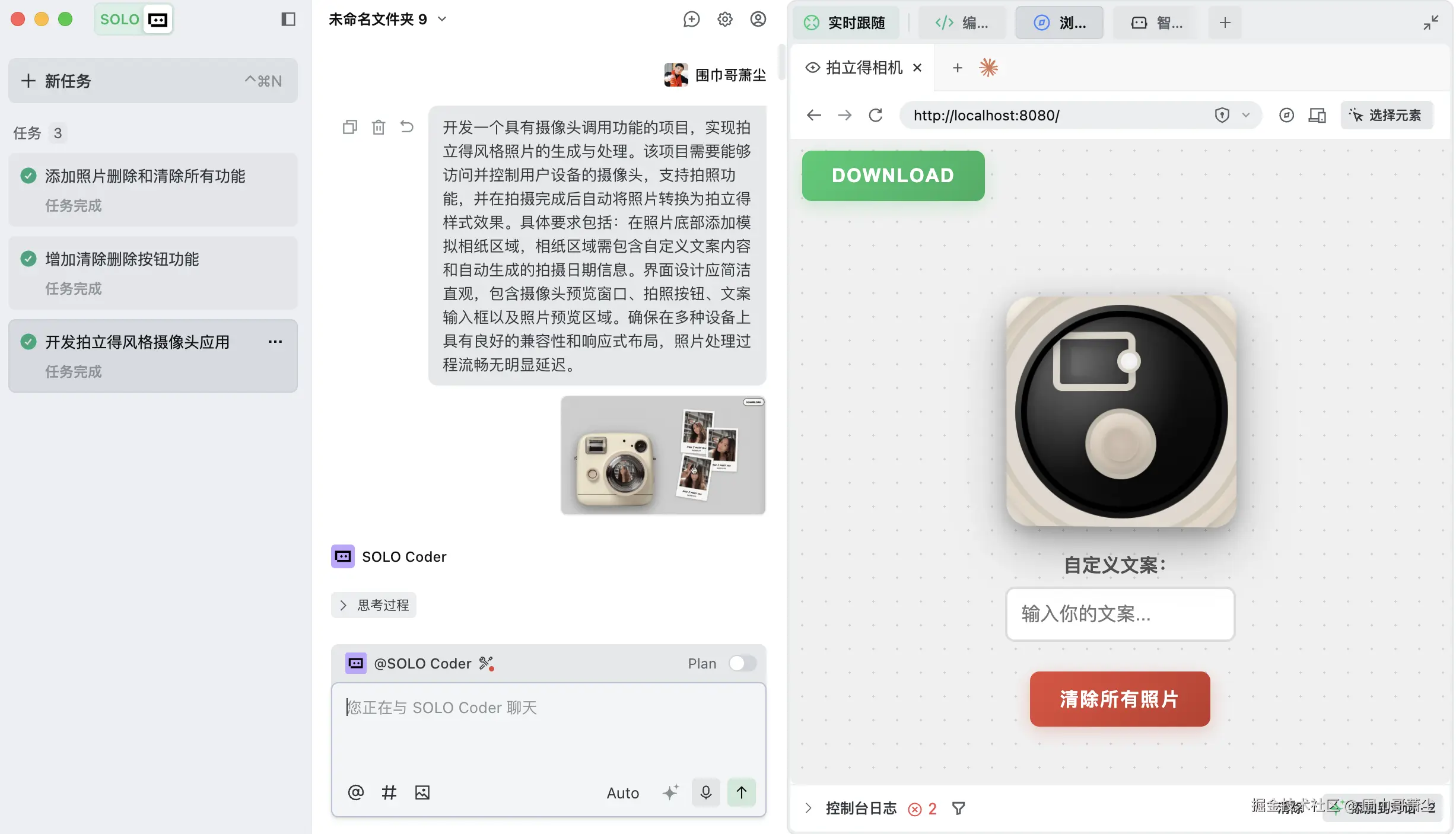 TRAE SOLO Code 3.0 拍立得国内版本开发实际演示🧣#TRAE 3.0 SOLO出道 并 @trae #SOLO已就位 #TRAE发布 ##TR
