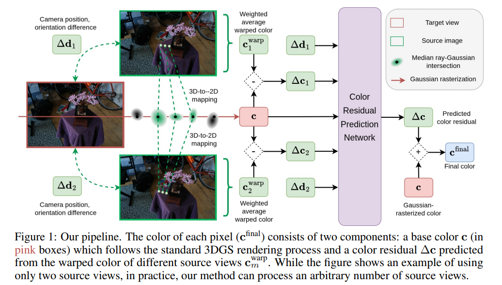亮点:针对传统3D高斯溅射(3DGS)依赖低阶球谐函数,难以捕捉空间变化颜色和镜面高光等视图依赖效应的缺陷,提出图像基高斯溅射方案;创新将像素颜色建模为"3DGS基色+邻近训练图像学习残差"的组合,兼顾高分辨率细节还原与视图特异性颜色表达;在不增加存储开销的前提下,显著提升新视角合成(NVS)质量,尤其在高频细节和准确视图依赖效果上实现SOTA突破。