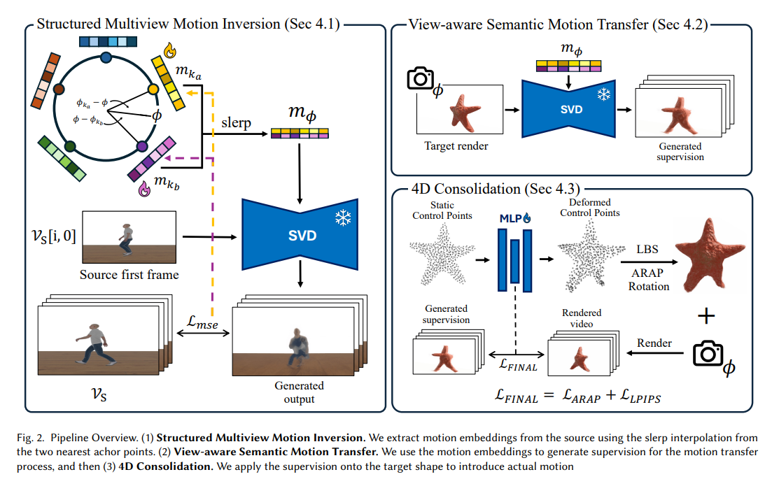 亮点:提出首个支持跨类别、语义对齐的无支架3D运动迁移方法,实现源视频运动向静态目标形状的精准迁移;创新引入锚点基视图感知运动嵌入机制,既保障跨视图一致性,又显著加速模型收敛;设计稳健4D重建流水线,有效整合含噪监督视频,优化动态3D高斯溅射(3D Gaussian Splatting)重建效果;建立首个语义3D运动迁移基准,实验验证其在运动保真度和结构一致性上显著优于现有基线。