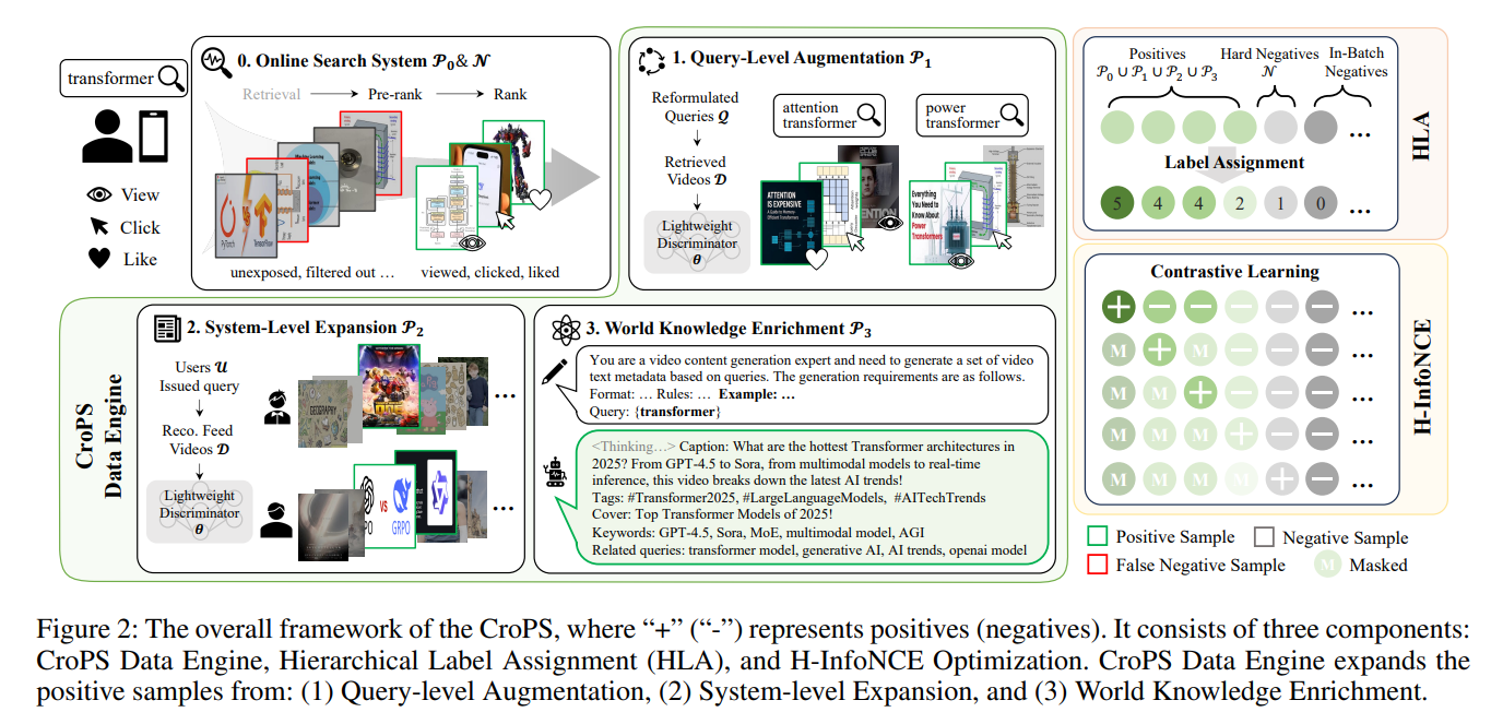 亮点:直击短视频搜索中密集检索的"过滤气泡效应"(依赖历史交互导致模型偏保守),提出CroPS跨视角正样本策略;从查询级(用户重写行为)、系统级(推荐流参与数据)、知识级(大模型世界知识)三维度引入多样化语义正样本;设计层级标签分配(HLA)策略与H-InfoNCE损失,实现细粒度、相关性感知的模型优化;在快手搜索大规模验证(离线+线上A/B测试),显著提升检索性能并降低查询重写率,已服务数亿日活用户。
