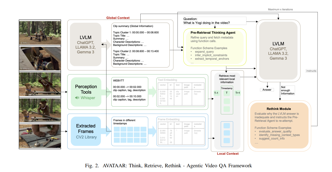 亮点:针对长视频问答中复杂查询(需综合理解与细节分析)的核心痛点,提出模块化、可解释的AVATAAR框架;创新融合全局视频摘要与局部上下文,设计"预检索思考代理+反思模块"的反馈循环,实现类人迭代推理,可根据部分答案优化检索策略;在CinePile基准上全面突破,temporal reasoning相对增益+5.6%、技术查询+5%、主题类问题+8%、叙事理解+8.2%,验证了各模块的正向贡献,为长视频QA提供兼具准确性、可解释性和扩展性的scalable解决方案。