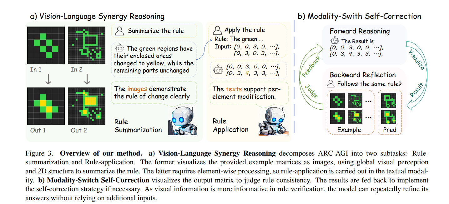亮点:破解ARC-AGI抽象推理任务的核心矛盾------纯文本方法规则执行不精确、纯视觉方法模式抽象不足;提出视觉-语言协同推理范式,明确两种模态的互补优势:视觉负责全局模式抽象与验证,语言负责符号规则制定与精确执行;设计VLSR(模态对齐子任务分解)与MSSC(视觉验证文本推理纠错)两大策略;在多款旗舰模型上实现最高4.33%的性能提升,为通用人工智能的抽象推理提供关键技术支撑。