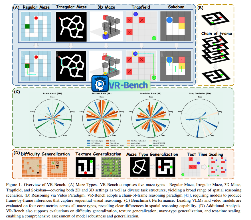亮点:开创"通过视频推理"新范式,将视频生成与空间推理结合,填补视频模型推理能力评估的空白;构建VR-Bench基准,包含7920个程序化生成视频(覆盖5种迷宫类型+多种视觉风格),实现对空间规划、多步推理能力的系统评估;实证表明SFT可高效激发视频模型推理潜力,其空间感知性能优于主流VLMs,且存在测试时缩放效应------多样化采样可将推理可靠性提升10-20%,为空间推理任务提供全新技术路径。
