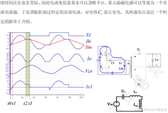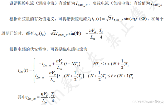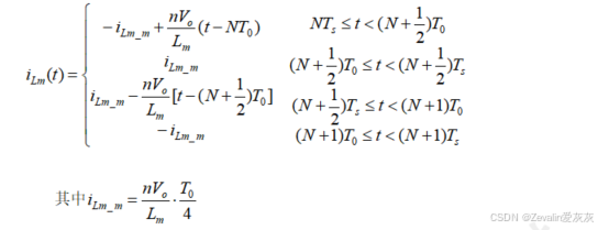 ⑤在开关死区中,开通晶体管前需要对晶体管的结电容进行放电,关断晶体管前需要对晶体管的结电容进行充电,这个过程是近似恒定不变的,根据电容的伏安特性,结电容的两端电压就是近似线性变化的,结合先前对LLC谐振变换器进行的数学分析,可以得出开关死区内的电感电流为