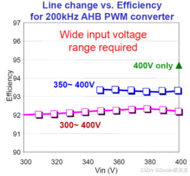横向对比以往介绍过的变换器,在宽输出电压下,LLC谐振变换器的效率可以说是完全领先的(深紫色线为LLC谐振变换器的效率,粉紫色线为PWM变换器的效率)
