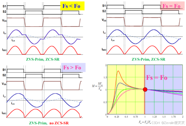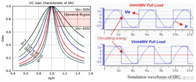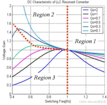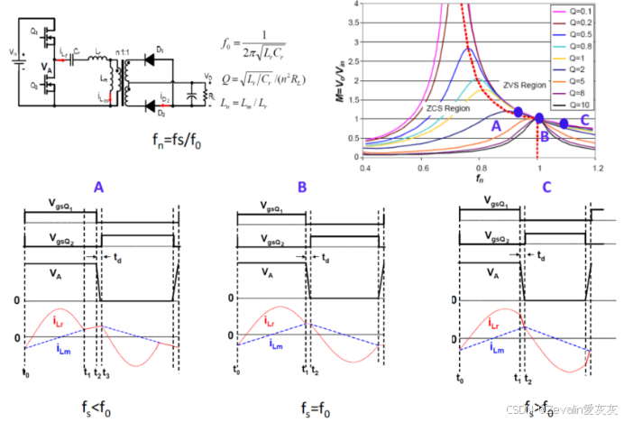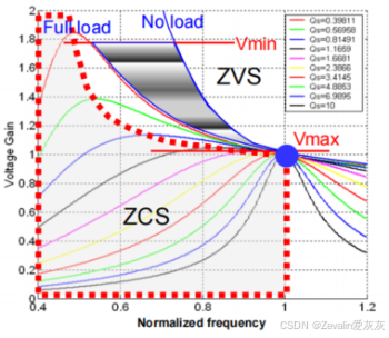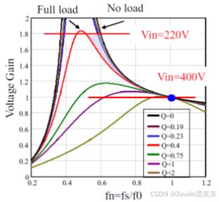 (7)下图所示的是LLC谐振变换器的增益曲线,当开关频率在串联谐振频率附近时,电路会有比较高的效率,如果输出电压降低,无论是轻负载还是重负载,都能实现ZVS技术。