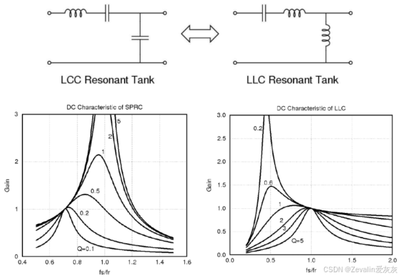 (1)下图所示的是串并联谐振变换器的增益曲线,与前两种谐振变换器不同的是,它存在一个与负载无关的恒压输出点(即负载电阻的变化不影响电压增益,此时和