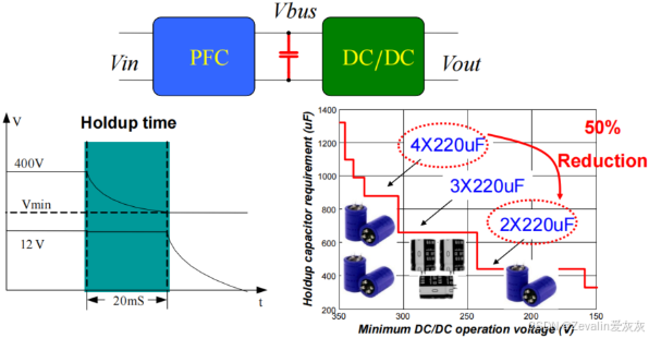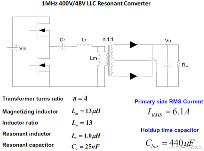 ①需求为(最大)输入电压为400V,输出电压为48V,输出功率为1000W,输出电压稳压时间(Hold-up time)为20ms,电路效率大于95%,负载变化范围为20%~100%,电路拓扑如下图所示。