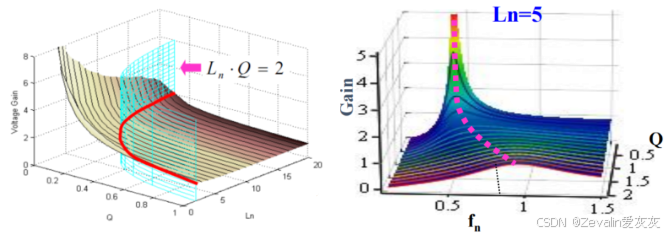 ⑧不同和Q值的组合所能达到的最大电压增益不同(开关频率等于并联谐振频率时达到最大电压增益),三个变量可构成一个三维空间中的扭曲平面,同时