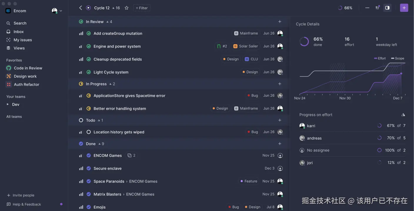 如果你受够了 Jira 的臃肿和卡顿,Linear 绝对能让你眼前一亮。它的界面极简、响应飞快,所有操作基本都能用键盘快捷键完成。它和 GitHub 的集成做得非常好,代码提交能自动更新任务状态。用它来管理 Sprint 和 Bug,感觉就像在写代码一样流畅。