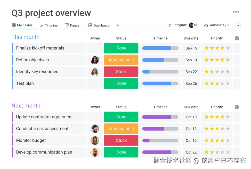 Monday 更像一个工作操作系统。它的强大之处在于高度的可定制性,你可以用它搭建出各种各样的工作流。它的各种视图(时间线、图表)非常丰富,很适合需要向管理层或非技术同事展示项目进度的场景。