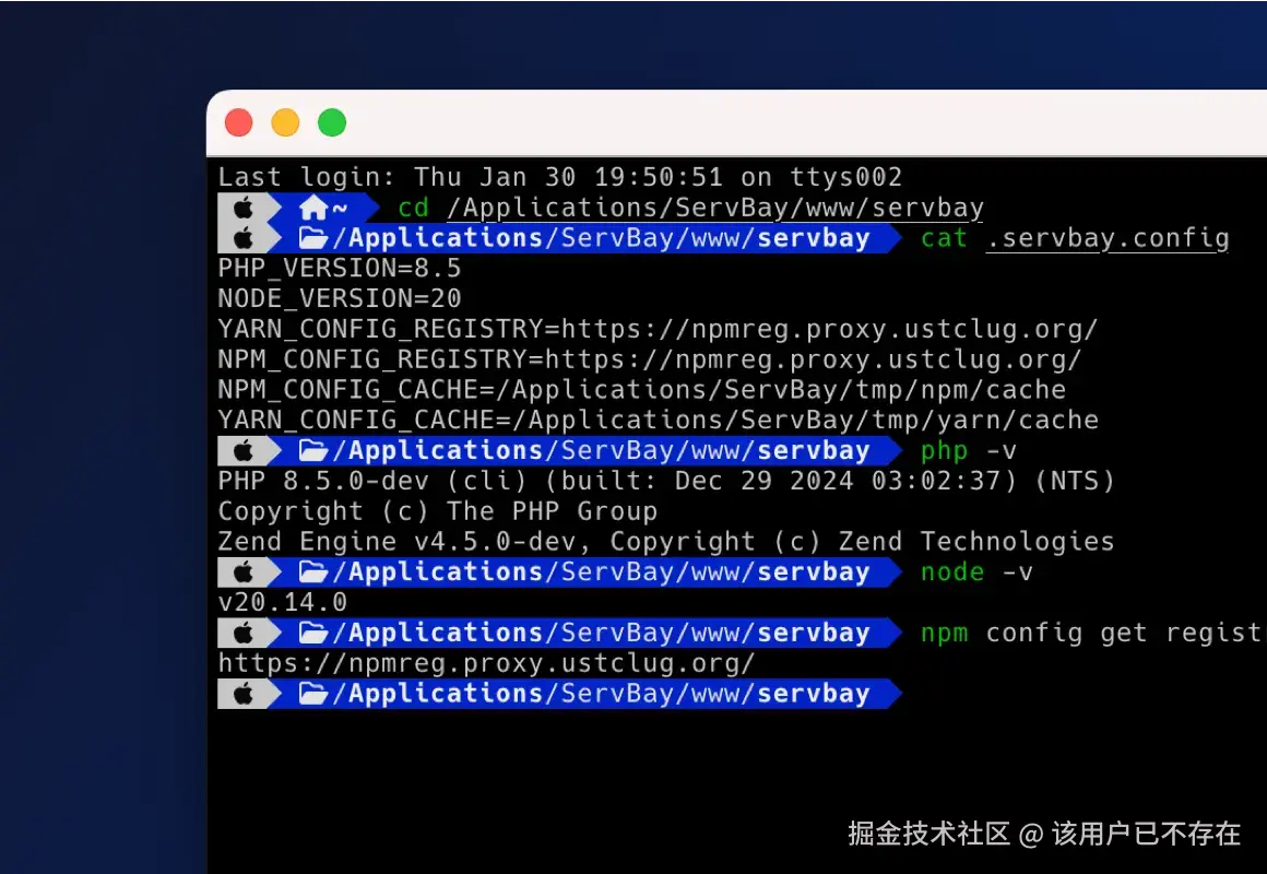 通过 .servbay.config ,团队负责人可以在这个文件里,精确指定项目需要用到的 Python 版本、Node.js 版本或者其他的语言,甚至是 Node.js 包管理器的仓库地址和缓存目录。然后把这个文件随代码一起提交到 Git 仓库。