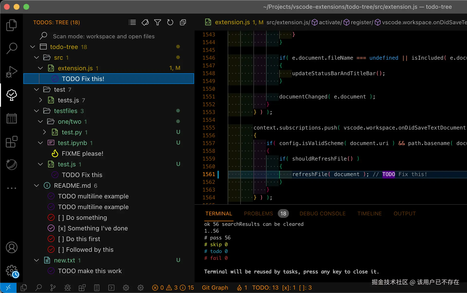 不是所有问题都需要拉着人实时沟通。有时候,我们在代码里发现一个小bug,可以先记下来。Todo Tree 这个 VS Code 插件就能派上用场。