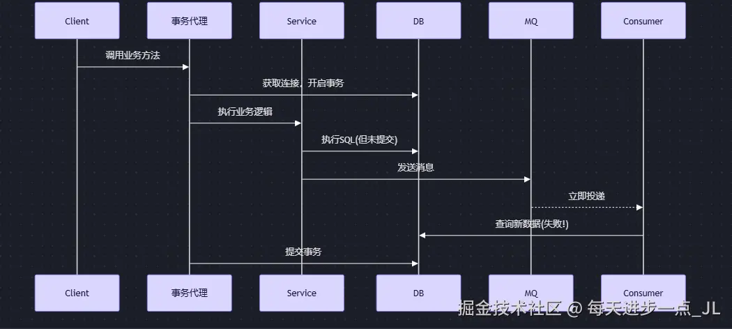 关键洞察:事务提交发生在方法执行结束之后 ,而非数据库操作之后。当mqProducer.send()执行时,事务尚未提交,数据对其他连接不可见。