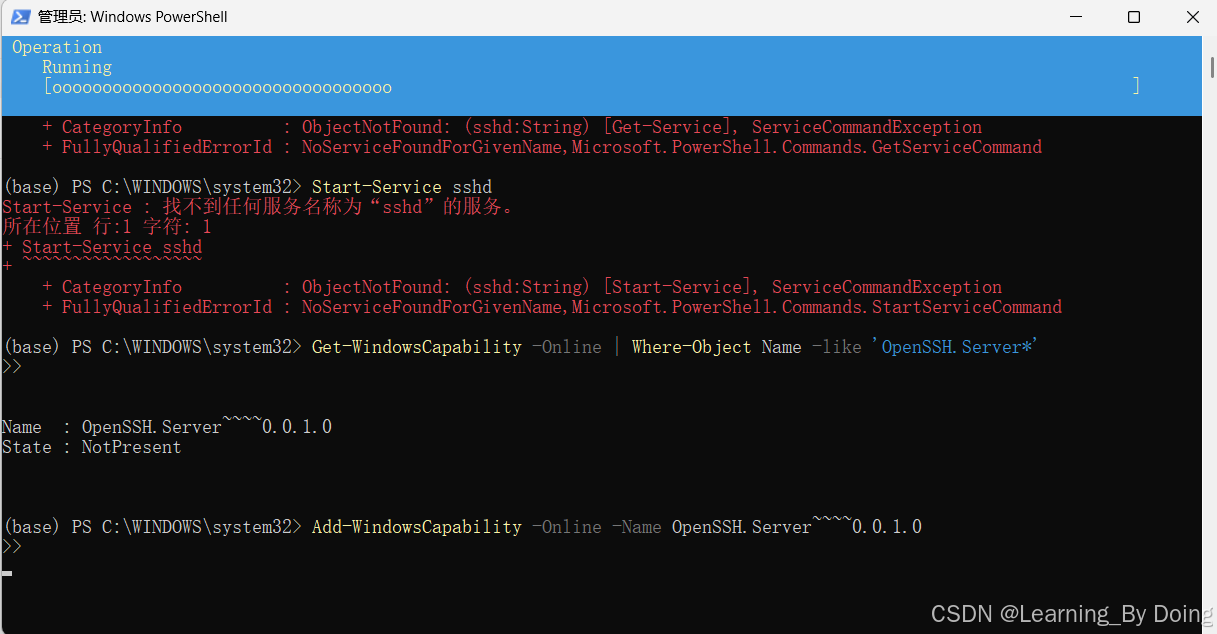 检查是否安装了OpenSSH.server,可以好使用下面命令在powershell管理员模式下测试: