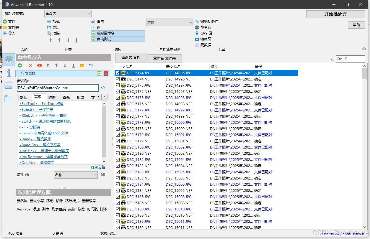 相机的文件命名一般是每9999张照片为一个循环,当快门数超过1万次时重新从0001开始命名文件,难以了解快门数,据此想到用快门数来命名,既可直观了解快门的寿命或工作量,也能有效避免文件名称重复问题。说干就干,经过一番学习,用软件Advanced Renamer成功解决问题。类似软件有很多。照片的EXIF信息中的"ShutterCount"字段即为快门数,知道这个就好解决了。用下图作说明,知识点在于下图左中上位置"新名称"下的重命名规则,即:DSC_<ExifTool:ShutterCount>